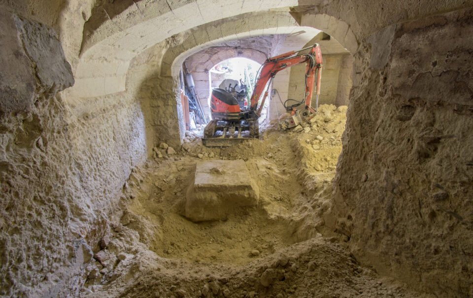 Après la démolition du pressoir et des cuves, un sablage des murs a été réalisé pour les nettoyer. C’est maintenant le début des travaux de maçonnerie avec un décaissement de 50cm à 1m dans tout le futur gîte troglodyte.